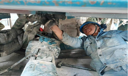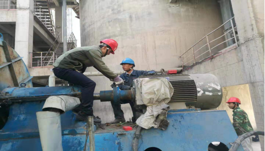 在其他設(shè)備檢維修現(xiàn)場,工人們依然具備這種“責(zé)任心”,如生料裝置接力風(fēng)機(jī)維修現(xiàn)場,檢維修工人通過測振儀更換“主軸”。