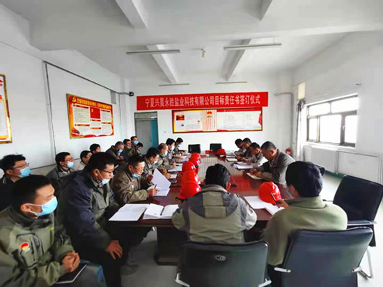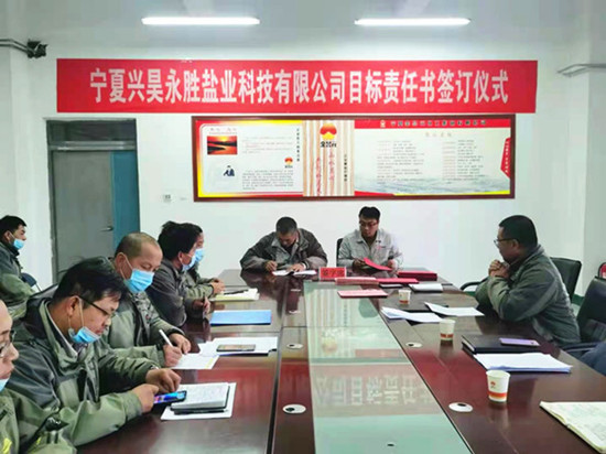 2021 年 1 月 7 日 15:30,寧夏興昊永勝鹽業(yè)科技有限公司召開了2021年首次安委會擴大會議暨安全生產目標責任書簽訂儀式。會議由公司總經理主持,公司安委會全體成員及技術員以上人員參加了本次會議。