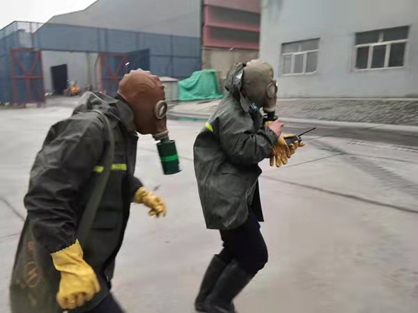 各組人員迅速展開搶險(xiǎn)救援步驟。調(diào)度張培基抽調(diào)班組義務(wù)消防員攜帶應(yīng)急物資(正壓式空氣呼吸器、酸堿手套、防毒面罩、警戒帶、雨鞋、雨衣、應(yīng)急藥箱)至2#脫硫配漿池處集合……以氨罐區(qū)為中心點(diǎn),將半徑20米范圍內(nèi)人員進(jìn)行疏散,根據(jù)風(fēng)向標(biāo)指示情況,將人員轉(zhuǎn)移至上風(fēng)口安全地帶,對泄漏點(diǎn)南側(cè)、北側(cè)、西側(cè)三面警戒隔離,防止無關(guān)人員進(jìn)入;義務(wù)消防員佩戴正壓式空氣呼吸器,穿防護(hù)服至脫硫罐區(qū)打開噴淋裝置,落實(shí)泄漏點(diǎn)具體位置,稀釋有毒氣體,并立即對泄漏點(diǎn)進(jìn)行修復(fù)。經(jīng)過15分鐘的現(xiàn)場搶險(xiǎn)救援,氨水泄露得到有效控制。