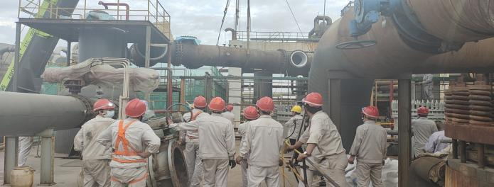 第一天氯乙烯裝置迅速拉開檢修戰(zhàn),先是對水堿洗組合塔進(jìn)、出管口線漏點(diǎn)進(jìn)行消除,安排吊車及相關(guān)人員在場,辦證,拆除管節(jié)前的準(zhǔn)備工作做好后立即組織人員開始卸閥門,在檢修工和吊車的完美配合下,漏點(diǎn)的管節(jié)拆除完成,后安排生產(chǎn)科主管去平羅襯塑。另外一邊精餾場地也是熱鬧非凡,檢修工作雖然忙碌但不盲目,人員拆除,你卸閥門,他焊缺口,我高空作業(yè),吊車協(xié)助拆卸高低塔塔盤篩網(wǎng),安全著陸后立即組織人員進(jìn)行清洗,清洗完成后又組織安裝,一切如行云流水,維修工熟悉的手法給安全檢修及順利開車又加了一道保險(xiǎn);旌厦撍芫技改是片區(qū)及集團(tuán)公司領(lǐng)導(dǎo)關(guān)注的重點(diǎn),此次檢修,管線碰口,也是尤為重要,在相關(guān)技術(shù)人員及維修工的協(xié)作下,做了氣相預(yù)留口,為后期混合脫水項(xiàng)目開車平穩(wěn)運(yùn)行埋下了伏筆。