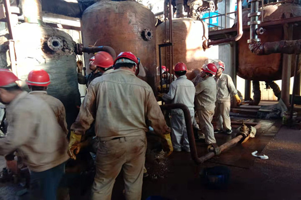 在完成了相關(guān)作業(yè)的準(zhǔn)備工作,參與檢修人員穿戴好各類防護(hù)用品,辦理各類票證后,大家就進(jìn)入到檢修現(xiàn)場。更換再沸器設(shè)備前,必須先排盡設(shè)備內(nèi)的氯化鈣,由于連接管線不能徹底排盡設(shè)備管線內(nèi)物料,只能通過人工接力的方式,將管線剩余的氯化鈣一桶一桶的接出,并迅速的倒入回收貯罐內(nèi)。整個(gè)過程必須密切協(xié)作,否則就會(huì)造成氯化鈣的大量外溢,在環(huán)保壓力如此大的今天,是絕對不容許的。經(jīng)過近一個(gè)小時(shí)的努力,設(shè)備管線內(nèi)的氯化鈣終于排放干凈。此時(shí)每個(gè)人的臉上都浸滿了汗水,這也是檢修人員最美麗的時(shí)刻。