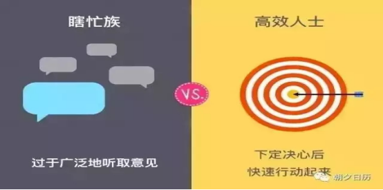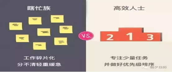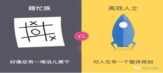 瞎忙族和高效的人的時(shí)間都安排得很滿,但是卻有本質(zhì)的區(qū)別。瞎忙族是沒有目標(biāo)和方向的忙碌,整天被外部力量推著趕著,永遠(yuǎn)有忙不完的活,永遠(yuǎn)在救火,但是卻說不上來忙了些啥,為了啥。而高效的人的一個(gè)共同特點(diǎn),就是對(duì)自己的人生有清晰的規(guī)劃,永遠(yuǎn)知道自己的目標(biāo)是什么,每一個(gè)階段的奮斗有什么意義。他們的忙碌是充實(shí),而不是庸碌。