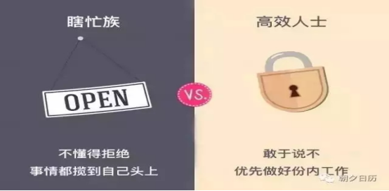 很多瞎忙族都是老好人,不懂得(或者不敢)拒絕別人,各種事情都往自己頭上攬。結(jié)果忙得焦頭爛額,連自己的份內(nèi)工作都沒做好,被上司責(zé)備。別人的事也做得馬馬虎虎,兩頭不討好。高效的人并非不熱心助人,但是能分清主次,明白份內(nèi)工作都沒做好的情況下,其他事情做得再多也沒意義。條件不允許的時(shí)候懂得合情合理地拒絕別人。