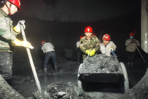 脫硫塔檢修現(xiàn)場(chǎng),塔內(nèi)料液堆積多,空間小,清理難度大,只能用小推車一車一車的拉運(yùn)到人孔門,再一鍬一鍬的鏟上鏟車,工作量非常大,只有熱力裝置的人很難在檢修時(shí)間內(nèi)完成料液清理工作。公司總經(jīng)理、副經(jīng)理守在現(xiàn)場(chǎng),協(xié)調(diào)各科室、裝置人員協(xié)助清理,兩天兩夜沒有間斷,在滿是泥水的脫硫塔內(nèi)來來回,奔跑了無數(shù)次,污泥沾滿了全身每一個(gè)地方,不知是汗水還是泥水浸濕了衣服,他們干活不分你我,不惜力氣,相互配合,安全高效的完成了料液清理工作,為下一步脫硫塔消漏、防腐做好鋪墊。