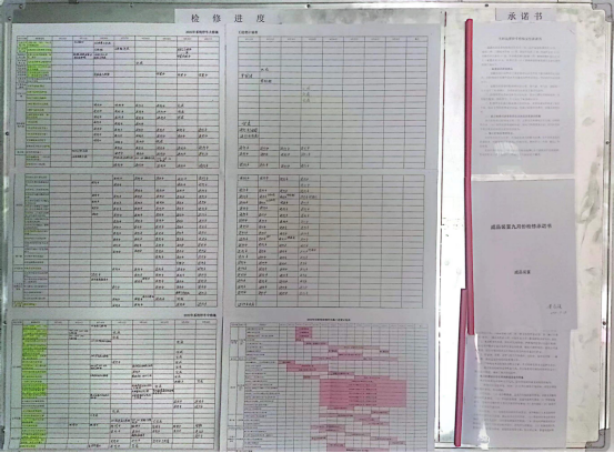 回轉窯、預熱器、烘干破高精選、1903提升機檢修是公司的檢修主線,從裝置停車到順利交付檢修后,再到單車試車,為保持工作“書面化”交流,抓好現場“痕跡化”管理,安環(huán)生產科每日嚴把檢修進度和質量,按照裝置原始開車要求,對單機試車等所有開工條件進行檢查,對現場反復進行確認。所有項目實行專人管理,表格上墻,逐臺設備,逐條管線,逐個閥門進行細致檢查,對發(fā)現的問題認真記錄,落實整改負責人及時整改。