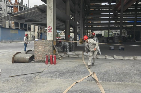 各應(yīng)急救援小組到達(dá)現(xiàn)場(chǎng),根據(jù)職責(zé)分工全力做好搶險(xiǎn)準(zhǔn)備工作。治安救護(hù)組按程序組織對(duì)現(xiàn)場(chǎng)設(shè)立警戒線,做好人員控制及疏散、道路疏通工作,生產(chǎn)保障組落實(shí)其他裝置生產(chǎn)及現(xiàn)場(chǎng)防汛情況,同時(shí)組織進(jìn)行滅火;搶險(xiǎn)搶修組現(xiàn)場(chǎng)進(jìn)行圍堰堵水并疏通排水溝。搶險(xiǎn)搶修結(jié)束后,對(duì)事故隱患再次進(jìn)行排查、消除,并有序恢復(fù)現(xiàn)場(chǎng)生產(chǎn)作業(yè)。