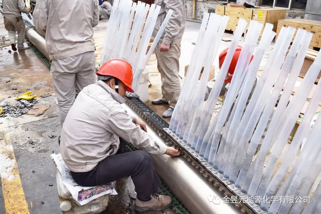 氯乙烯裝置檢修現(xiàn)場,檢修人員正四、五人一組,齊心協(xié)力的給除霧器濾筒裹上厚厚的“棉衣”,為檢修VI轉(zhuǎn)化除霧器做好準(zhǔn)備工作。