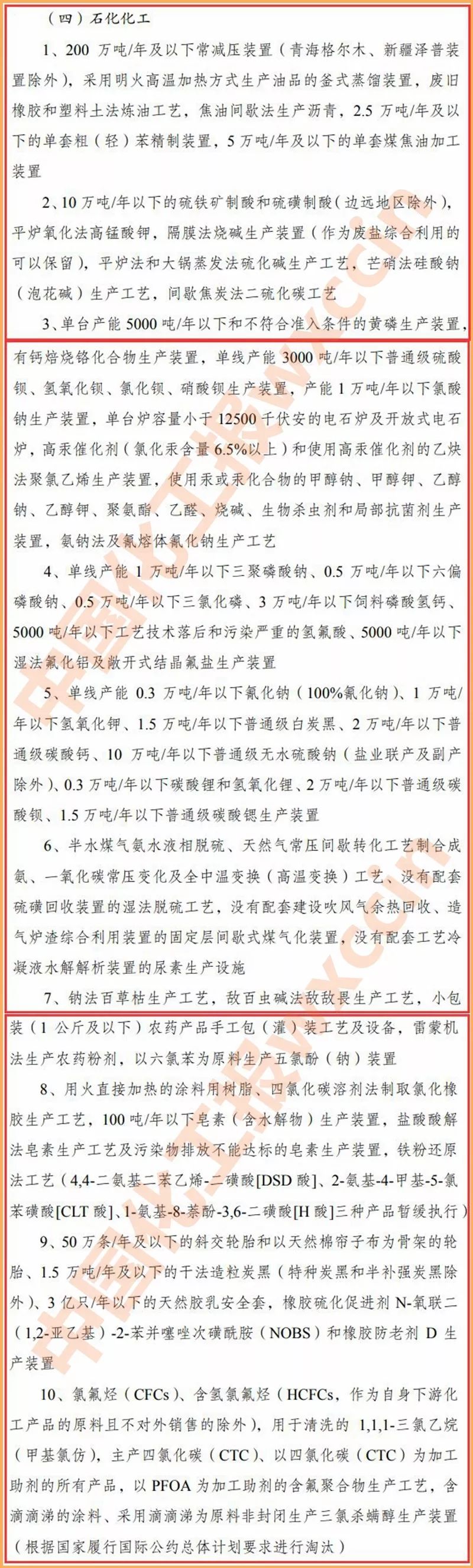石化化工行業(yè)淘汰類有10大類,比征求意見稿少了2大類,包括:200 萬噸/年及以下常減壓裝置,2.5 萬噸/年及以下的單套粗(輕)苯精制裝置,5 萬噸/年及以下的單套煤焦油加工裝置;單臺產(chǎn)能 5000 噸/年以下黃磷生產(chǎn)裝置;半水煤氣氨水液相脫硫、天然氣常壓間歇轉(zhuǎn)化工藝制合成氨、一氧化碳常壓變化及全中溫變換(高溫變換)工藝、沒有配套硫磺回收裝置的濕法脫硫工藝,沒有配套建設(shè)吹風(fēng)氣余熱回收、造氣爐渣綜合利用裝置的固定層間歇式煤氣化裝置,沒有配套工藝?yán)淠核饨馕鲅b置的尿素生產(chǎn)設(shè)施;鈉法百草枯生產(chǎn)工藝,敵百蟲堿法敵敵畏生產(chǎn)工藝,雷蒙機(jī)法生產(chǎn)農(nóng)藥粉劑,以六氯苯為原料生產(chǎn)五氯酚(鈉)裝置等。