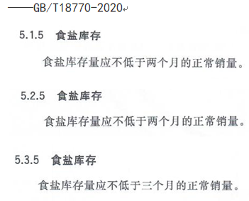 GB/T18770-2020標(biāo)準(zhǔn)提出A、AA級(jí)企業(yè)“應(yīng)不低于”二個(gè)月正常銷量?jī)?chǔ)備,AAA級(jí)企業(yè)“應(yīng)不低于”三個(gè)月正常銷量?jī)?chǔ)備,井礦鹽區(qū)生產(chǎn)精制鹽按市場(chǎng)需要產(chǎn)出,不象海湖鹽區(qū)產(chǎn)場(chǎng)集中生產(chǎn)堆垛,在目前市場(chǎng)競(jìng)爭(zhēng)條件下難以實(shí)現(xiàn),能夠達(dá)到一個(gè)月正常銷量食鹽儲(chǔ)備都很不錯(cuò)了。
