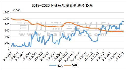 如上圖,可以明顯看出,從2019年至今,99%片堿與50%離子膜液堿折百價格差有不斷縮減趨勢,這意味著片堿行業(yè)利潤下滑,2020年上半年中國片堿市場價格大幅下滑,跌落至近十年的歷史低位。