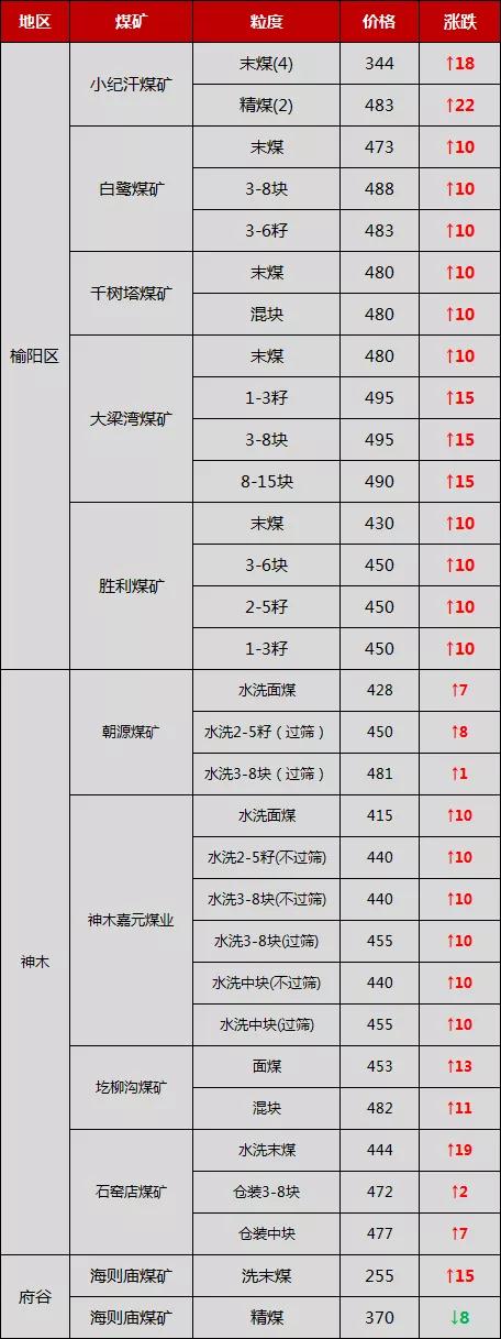 近日,榆林煤礦地銷價持續(xù)上漲,主要因為大型礦井都以保鐵路發(fā)運為主,地銷量非常少,所以許多地銷客戶只能從小型礦井拉運,助推煤價上漲。 比如,目前榆陽區(qū)小紀(jì)汗煤礦、杭來灣煤礦、榆樹灣煤礦、金雞灘煤礦地銷量非常少,所以榆陽區(qū)其他小礦持續(xù)上調(diào)價格。 最新調(diào)價表: