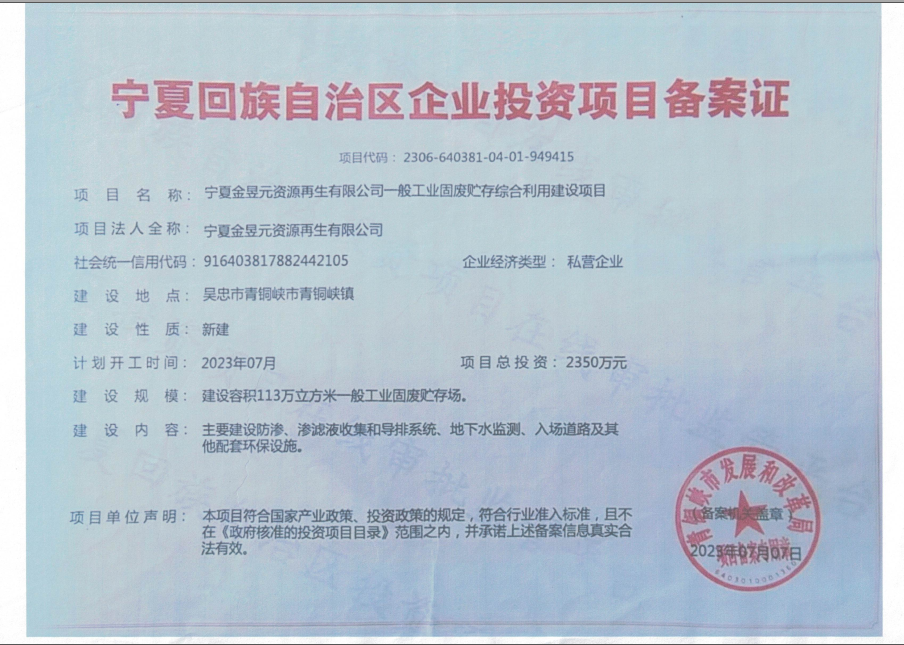 寧夏金昱元資源再生有限公司一般工業(yè)固廢貯存綜合利用建設(shè)項目環(huán)境影響報告書公眾參與初次公示